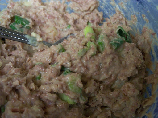 In a bowl, add 1 can of corned beef and smoosh it up with the spoon.