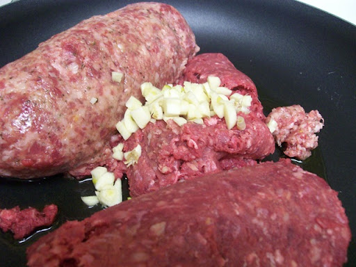 We start with 1 1/2 lbs of ground beef (I only used 1lb though), 1 lb HOT breakfast sausage and don't even worry because you can't taste the heat, but it definitely makes the lasagna for me.........and 2 cloves of minced garlic.