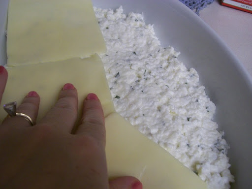 Then spread half the cottage cheese over the noodles.