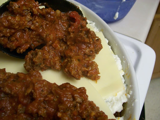 In the meantime you need to boil some lasagna noodles, just add a little olive oil and 1/2 teaspoon of salt to the water. I actually got the No Cook Lasagna Noodles and it worked fine for me, so whatever you want, go for it.
