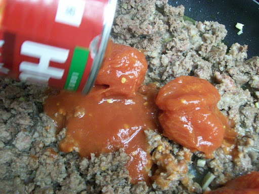 Cook until brown and then remove some of the liquid. Ree suggests leaving in some to give it taste....so that's what I did. Next we add 2 cans (14.5 oz) whole tomatoes and 2 (6 oz) cans of tomato paste.