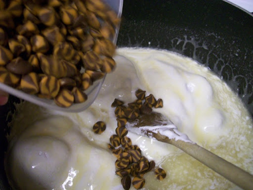 Stir in the chocolate. I used 1 box of white cooking chocolate and half a bag of chocolate/caramel chips. Yummy! Mix everything together until the marshmallow and chocolate is melted.