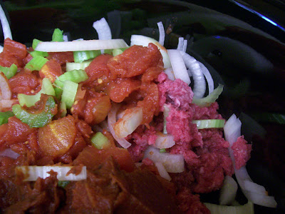 Place beef, onions and water in slow cooker. Add tomatoes and tomato paste; stir well. Add celery, green pepper and beans. Stir in seasonings to taste; top with corn. Cover and cook on low setting for 8 to 10 hours, or on high setting for 5 to 6 hours, stirring occasionally.
